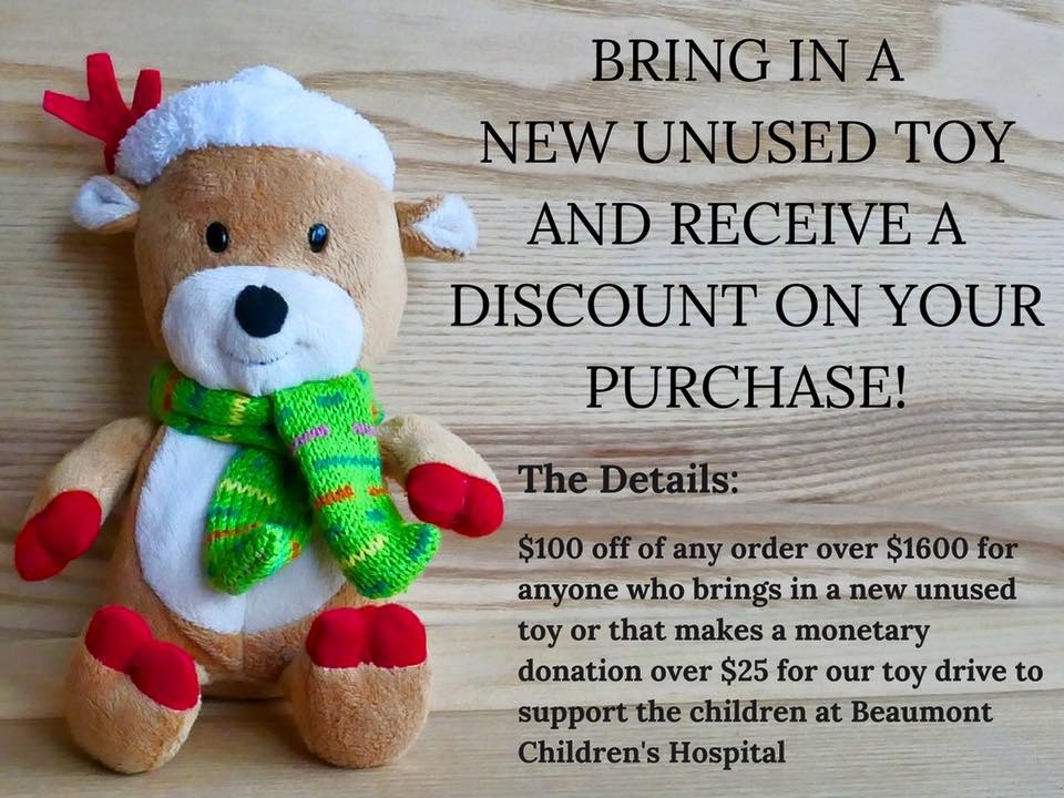 The store had flyers made, urging customers to bring new, unused toys in for donation and receive a discount on their purchase! The store generously offered to discount $100 off any order over $1600.