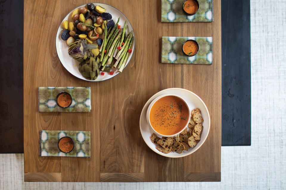 When it comes to designing a space, it’s all about layers: What will help each layer of the space stand out to its best advantage? As we mentioned before, contrast is key. Smooth, hand-thrown dishware plays up the colorful food, and an immaculate walnut table highlights the ceramic dishware.